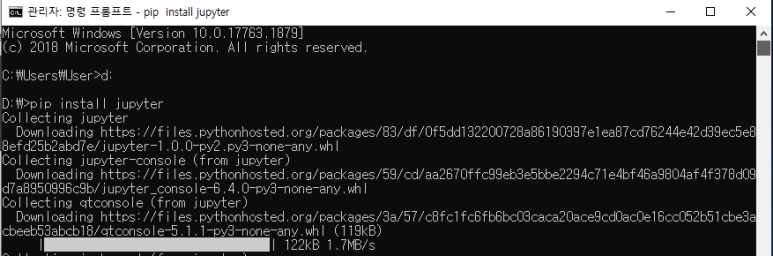 2. Python이 설치되었다면 window cmd 창에서 pip intall jupyter 를 입력해서 설치하자.