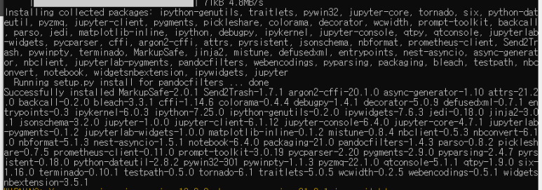 3. 아래는 설치가 완료된 화면이다. 가끔 특정 프로그램의 버전이 안맞아서 에러가 나는 경우도 있다.