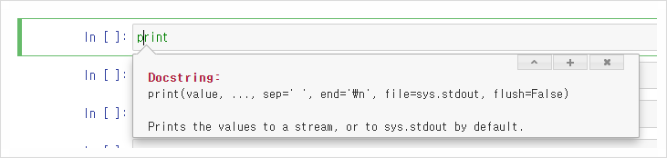 코드 입력 후 Ctrl + Enter key, Shift + Enter key, 혹은 Alt + Enter key 이다. 차이점은 Ctrl + Enter는 실행만 되고, Shift나 Alt는 실행도 되고, 다음 셀이 없다면 다음 셀도 추가해준다.