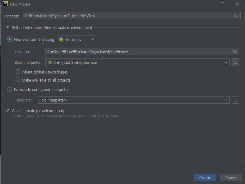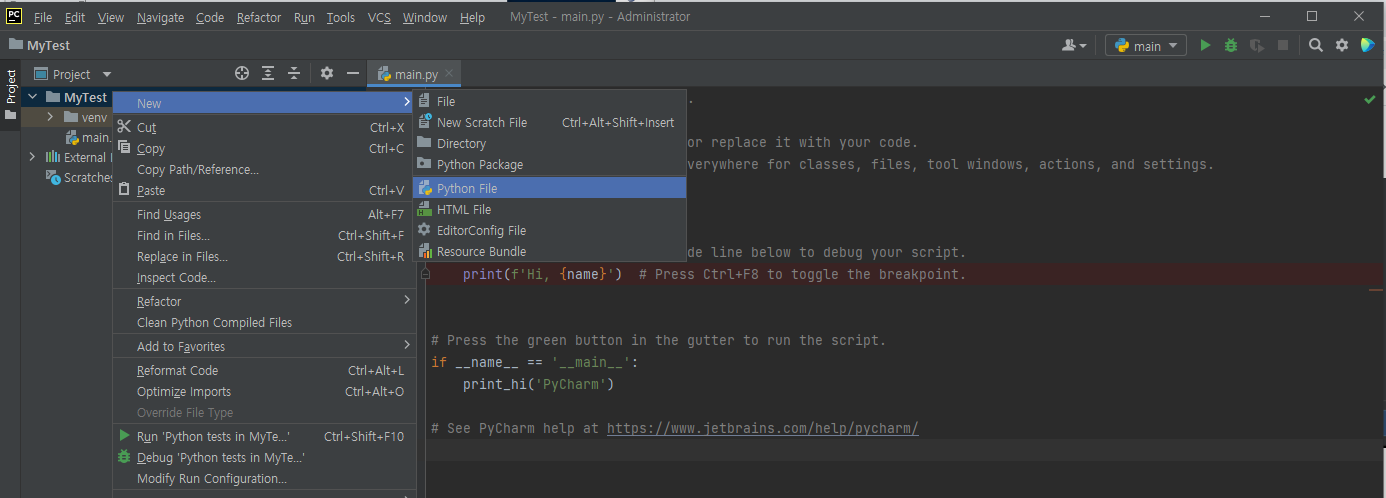 5. 아래와 같은 화면이 나오고 MyTest를 선택후 마우스 오른쪽 버튼 클릭해서 New > Python File을 선택해서 Python 파일 하나를 생성 하였습니다.
