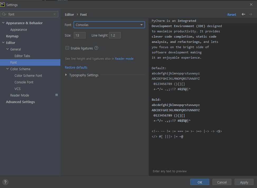 7. Font는 Setting에서 font를 검색해서 변경 가능 합니다.