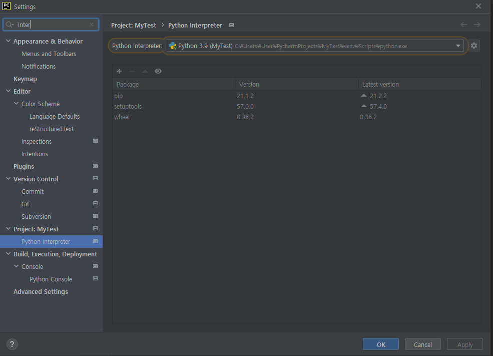 6. 생성된 프로젝트의 Python 버전은 File > Settings 를 선택후 inter라고 입력해서 확인 가능 합니다. 필요시 버전을 변경해서 사용 가능 합니다.
