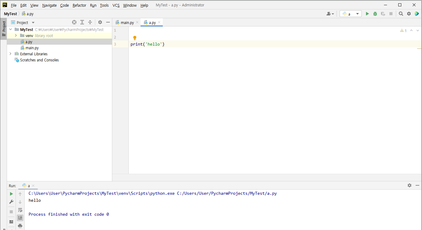 8. 코드 작성 후 Ctrl + Shift + F10 을 누르면 아래와 같이 실행 됩니다.