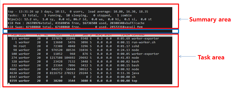 시스템의 요약 정보와 현재 Linux kernel에서 관리하는 프로세스 또는 쓰레드 목록을 보여 줍니다. 이 명령을 실행하면 위쪽 절반 부분에 프로세스 및 리소스 사용 통계가 포함되는 대화식 명령 모드가 열립니다. 그리고 하단에는 현재 실행 중인 프로세스 목록이 포함되어 있습니다. 실행 시 옵션을 포함하거나 top 실행 중 명령을 입력해서 원하는 출력을 볼 수 있습니다.