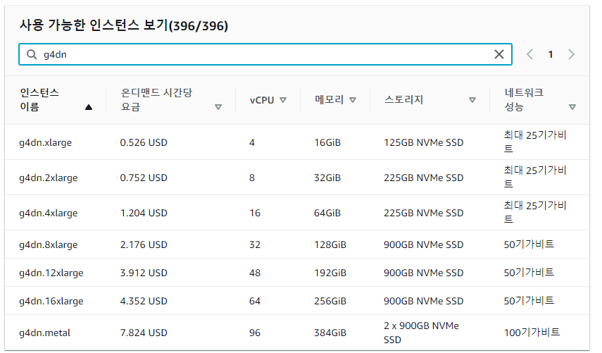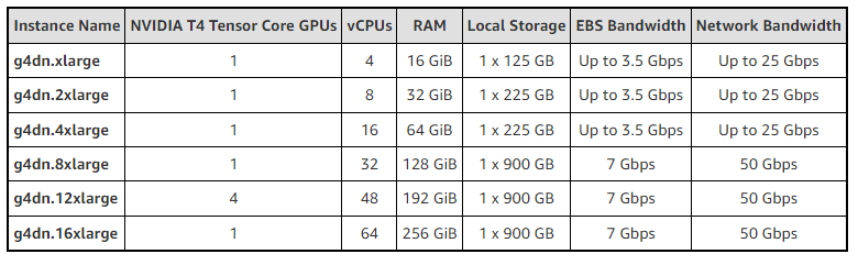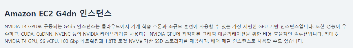 AWS g4dn에 대한 정보는 다음과 같습니다.