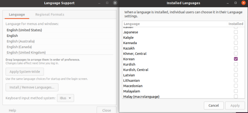 2. Language Support에서 한국어가 설치 되어 있는지 확인