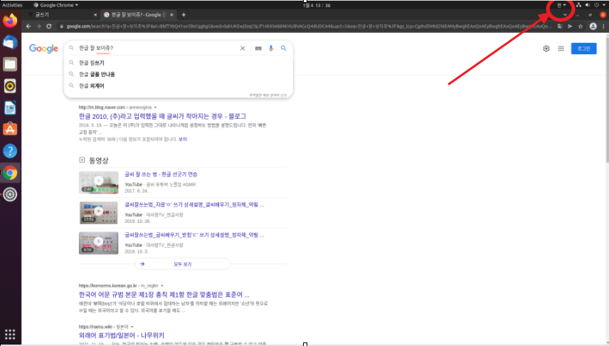 ★ 혹시 아래 Korean (Hangul)가 보이지 않는다면 재 부팅을 해보자. 언어팩을 설치후 재 부팅 필요한듯 하다.
