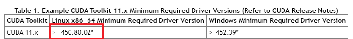 CUDA 11.2를 위해서는 최소 450.80.02 이상만 깔면 된다고 한다. Minimum Required Driver 버전이다.
