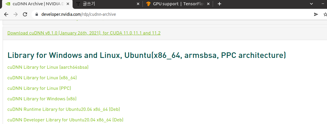 아래의 사이트에서 다운로드 가능하다. Linux (X85_64)용 cuDNN Libary를 설치한다.