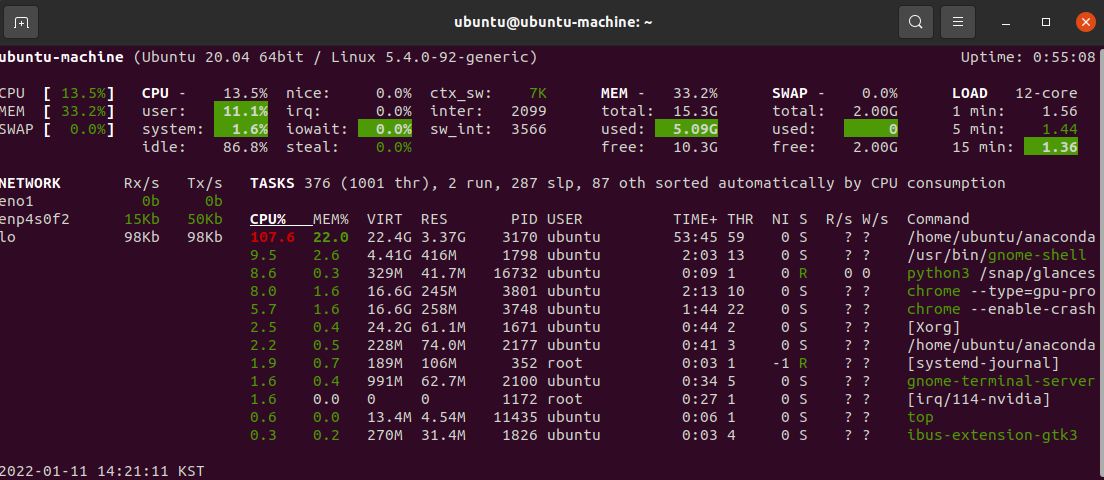 4. glances (패키지 설치 필요, sudo snap install glances 후 glances 명령 사용)