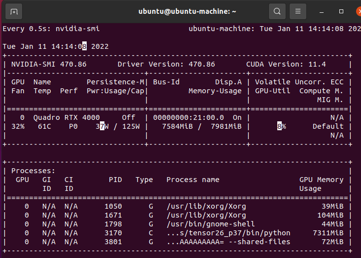 2. watch -d -n 0.5 nvidia-smi (0.5초 간격으로 Diff에 대해서 Highlight 해서 보여줌 - 아래 하얀 부분)